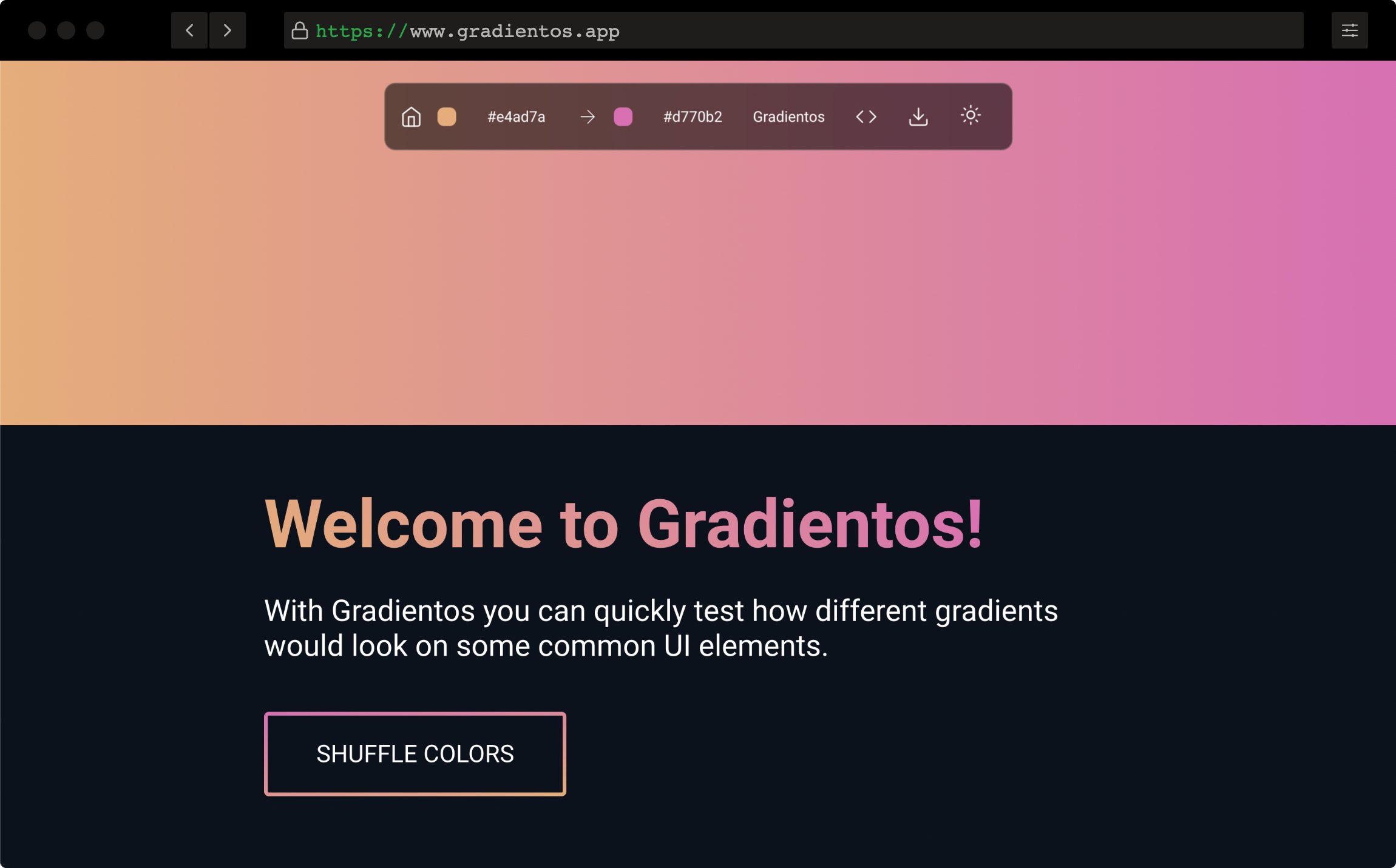 Gradientos is a web app which can help you choose gradients by simply showing your selected gradients on a live demo website with some common UI elements. You can quickly see how the gradient actually looks on a website. Play around and create your own gradient or select one from our collection.