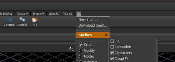 Save the file and start Houdini. On the main shelf toolbar add the Searcher shelf by clicking on the plus(+) button, then the Shelves tab, followed by selecting "Searcher Shelf" seen in the images below:
