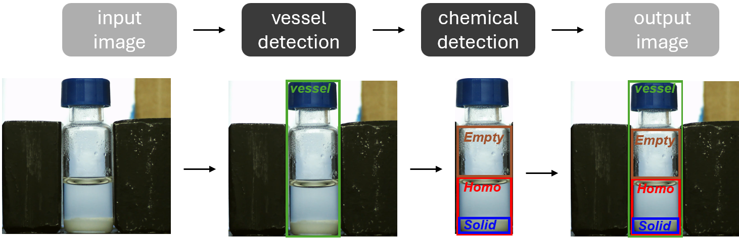 - Vessel Detection Model: Identifies transparent laboratory equipment (e.g., reactors and vessels) and marks them as "vessels."