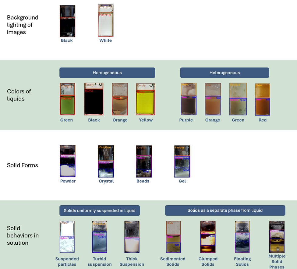 - Different solid forms and behaviors in liquid environments This dataset enables monitoring of key experimental behaviors, including dissolution, melting, mixing, settling, and others, to address complex experimental conditions. A representative set of images is shown in Figure 2.