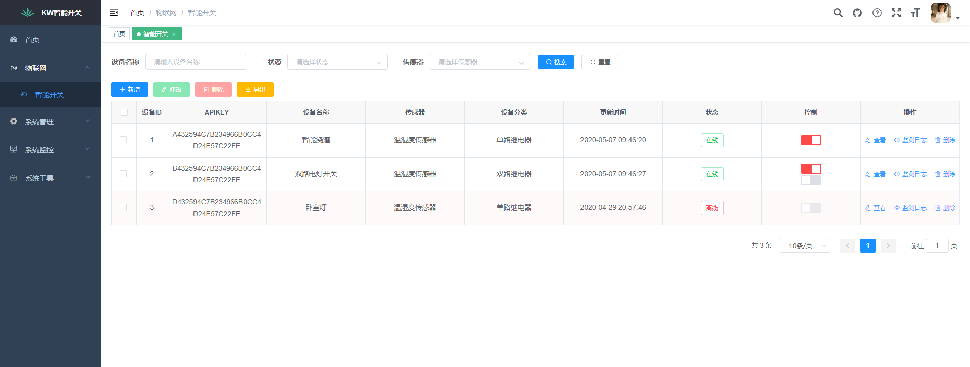 应用场景:智能开关的应用场景比较广泛,一般家里通电即可使用的设备都能搭配该模块,升级为网络版,进行联网控制。常见的就是智能开关、智能插座和智能灯,搭配土壤湿度传感器可以实现智能浇灌,搭配温湿度传感器可以监控温湿度,其他传感器例如:触控开关、雨滴探测、声音传感器、光敏传感器、烟雾传感器、火焰报警、人体感应等等。