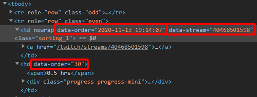all data can be found on twitchtracker if you inspect element on the stream link in the streams page https://twitchtracker.com/twitch/streams