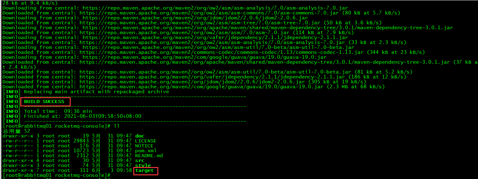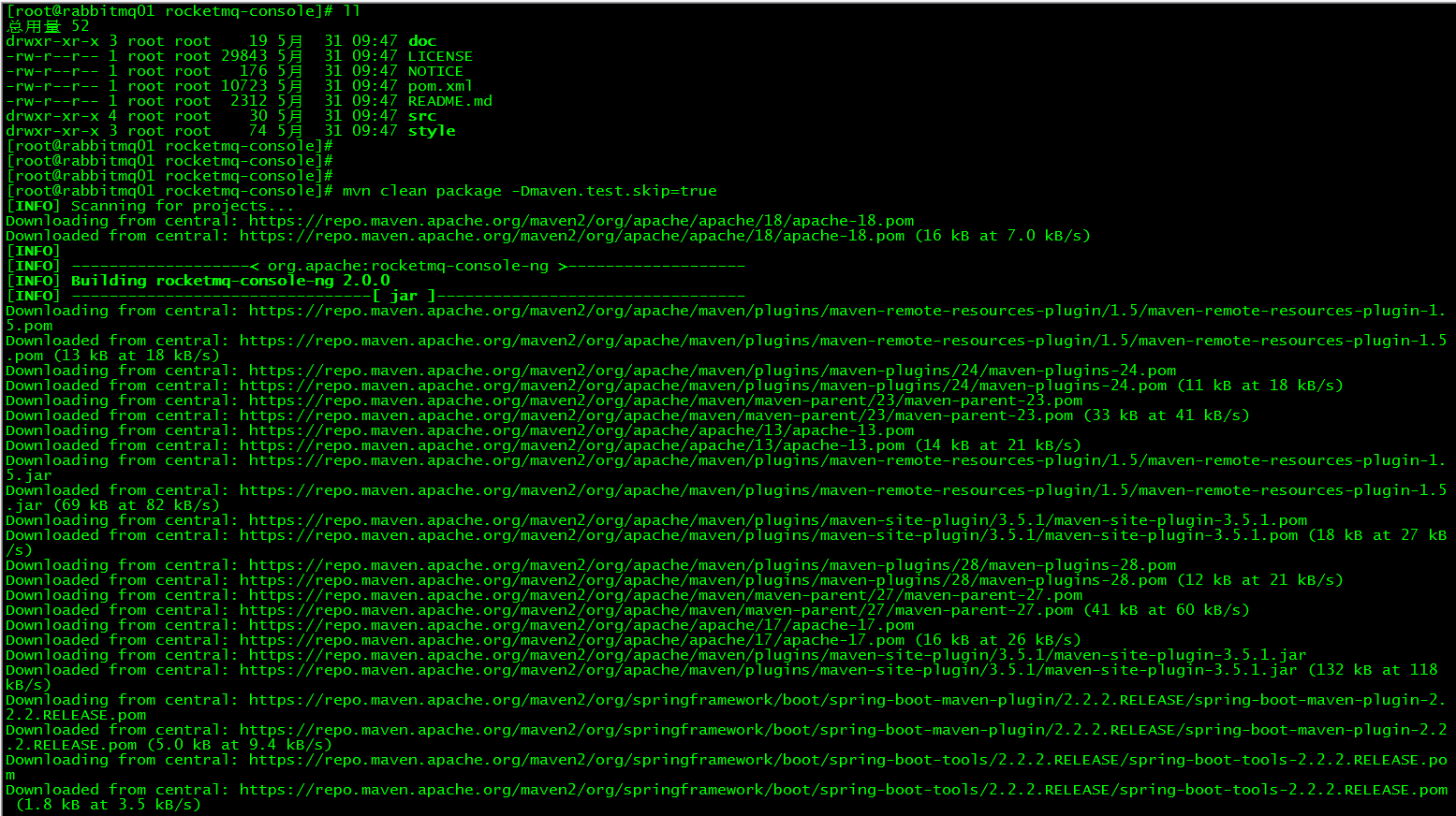 [root@rabbitmq01 rocketmq-console]# mvn clean package -Dmaven.test.skip=true编译过程如图,中间过程省略