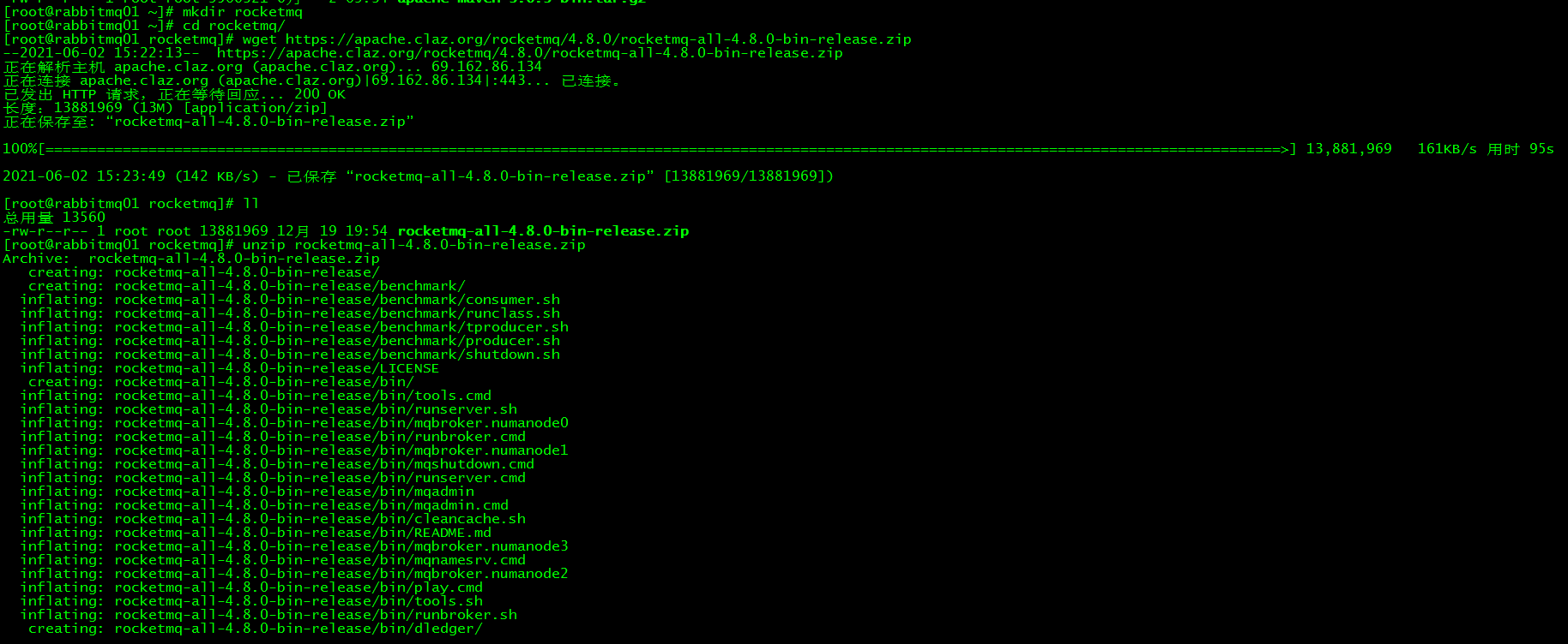 [root@rabbitmq01 rocketmq]# wget https://apache.claz.org/rocketmq/4.8.0/rocketmq-all-4.8.0-bin-release.ziprocketmq-all-4.8.0-bin-release.zip带bin版本的介质无需maven编译,解压后即可使用。
