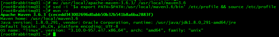 [root@rabbitmq01 ~]# sed -i '$a export PATH=$PATH:/usr/local/maven3.6/bin' /etc/profile && source /etc/profile