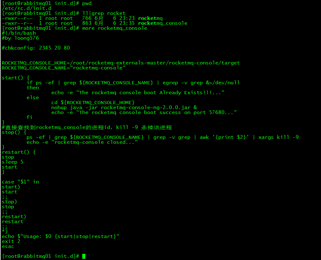 [root@rabbitmq01 init.d]# more rocketmq_console [root@rabbitmq01 ~]# service rocketmq_console stop