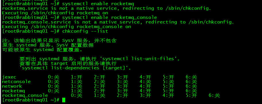 [root@rabbitmq01 ~]# chkconfil --list设置完成后开机会自启动namesrv、broker和console服务