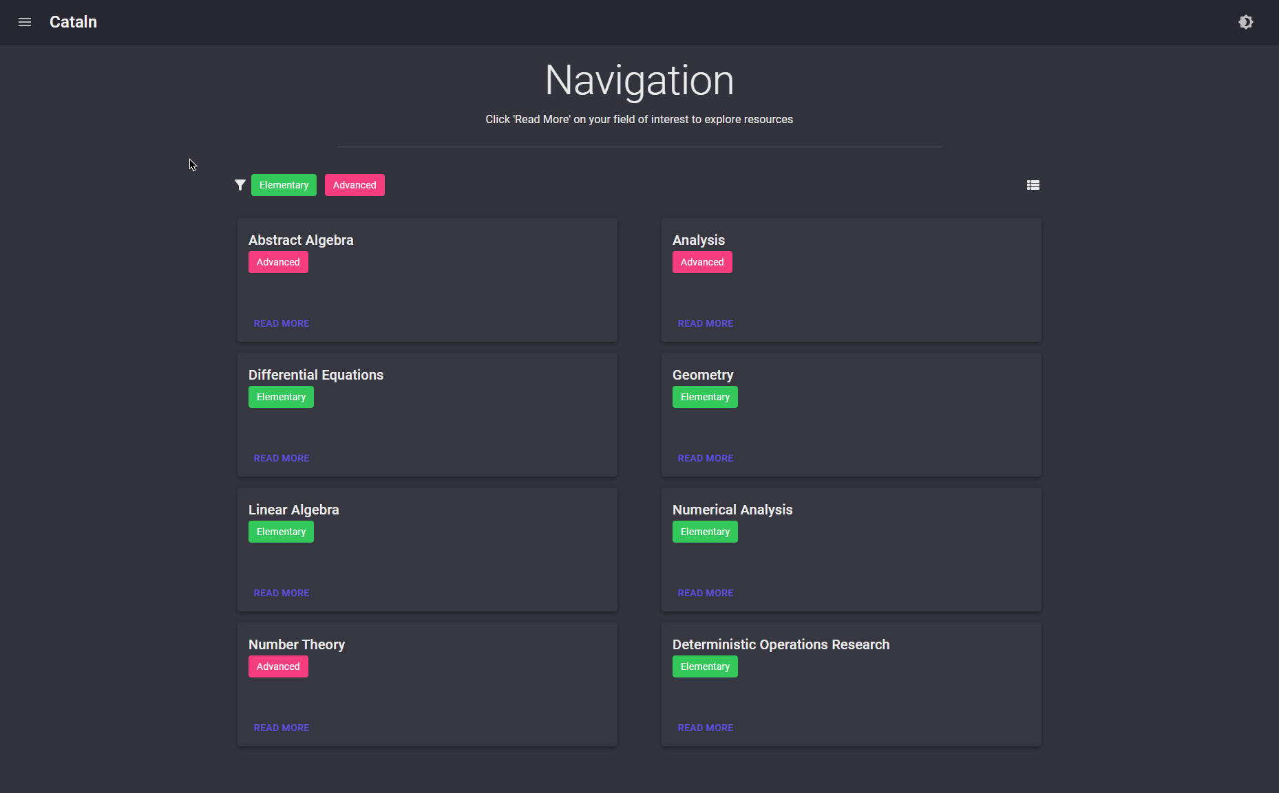 On the navigation page you can browse various fields in mathematics. These fields or organized by difficulty (elementary, advanced) which you may filter by. From there you can select Read More on your field of interest to explore resources!