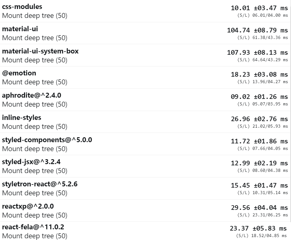 Here are benchmarks with dynamic styles of several popular libraries (note the Material-UI v4 only use static styles which have good performance):
