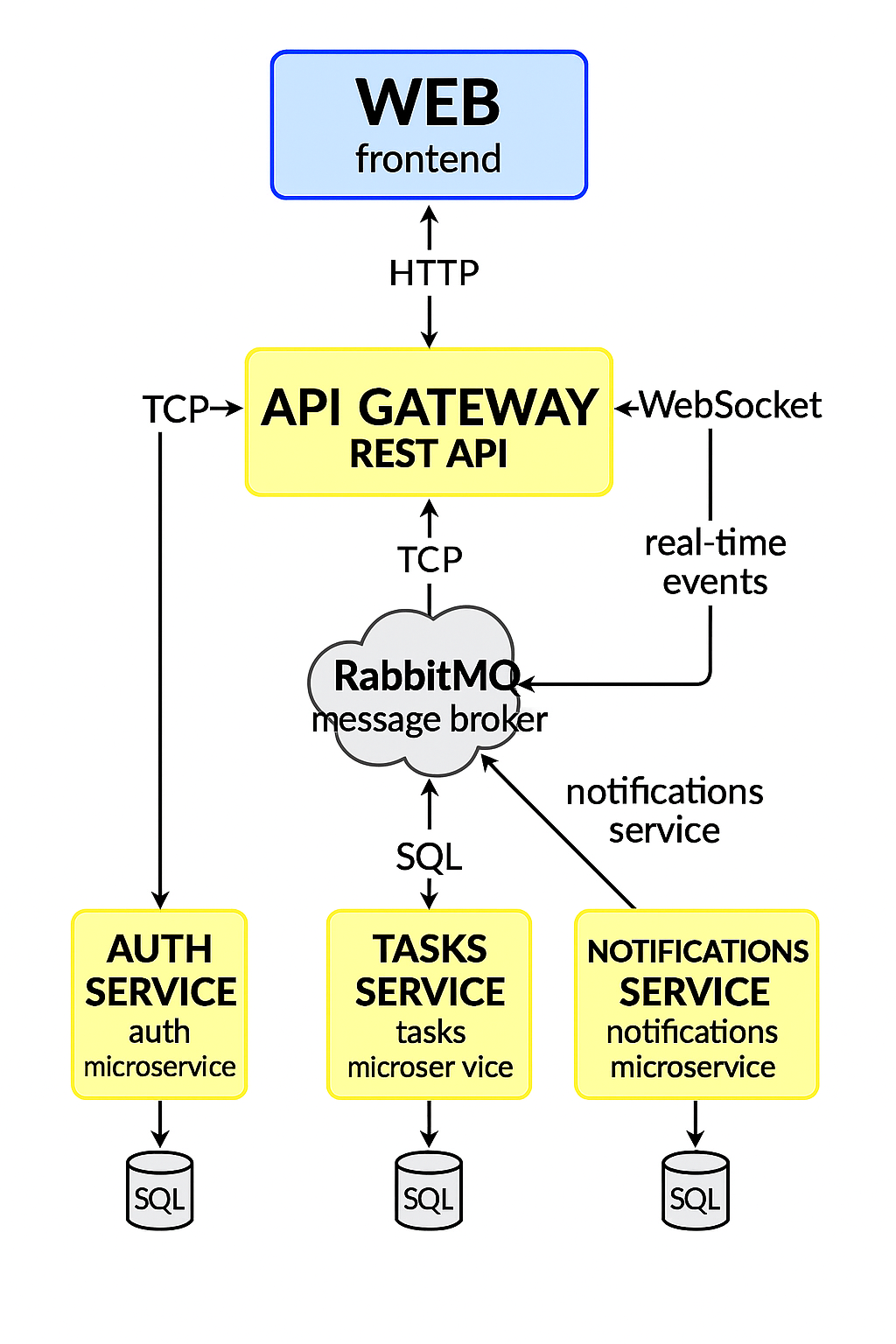- Decisão: divisão clara de responsabilidades (auth, tasks, notifications).