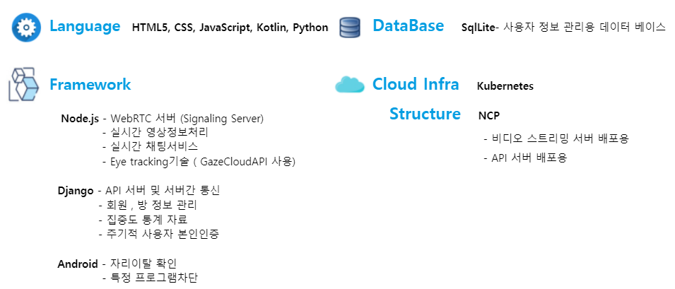 POST/ → 사용자 아이디 중복 체크 및 비밀번호 재입력 확인 요청POST/ login → 사용자 아이디 및 비밀번호 요청GET/ logout → 로그아웃POST/ makeroom → STUDY/EXAM 모드에 따라 방생성POST/ makeroom/success → 방 생성 성공 후 방 정보 나열POST/ enteroom/exam1 → EXAM 모드 앱 차단 여부 요청POST/ enteroom/exam2 → EXAM 모드 얼굴 인식 확인 요청POST/ enteroom/exam3 → EXAM 모드 WebRTC 입장 가능 여부 요청POST/ enteroom/study1 → STUDY 모드 앱 차단 여부 요청POST/ enteroom/study2 → STUDY 모드 WebRTC 입장 가능 여부 요청GET/ roomout/int:time/str:mode → mode가 STUDY 일때 해당 사용자의 Analytics에 time이 저장됨POST/ roomout/int:time/str:mode → App 접근 차단을 해제 하였는지 요청 & mode가 STUDY 일때 저장돤 time, app, person 변수를 바탕으로 level, rate를 측정하고 Analytics 모델에 저장GET/ roomout/study → session에서 사용자 정보를 가져와 Analytics 모델의 가장 마지막 row를 DB에서 가져와서 집중도 그래프를 그림POST/ roomout/exam → 시험이 성공적으로 종료 됐는지 요청GET/ list/room → Room DB에서 사용자 이름으로 만들어진 Room을 QuerySet으로 반환후 list 나타냄GET/ list/analytics → Analytics DB에서 사용자 이름으로 만들어진 Analytics를 QuerySet으로 반환후 list 나타냄POST/ list/analytics/int:pk → Analytics List에서 선택한 QuerySet 객체의Primary Key 값과 같은 row를 DB에서 가져와 집중도 그래프를 그려줌