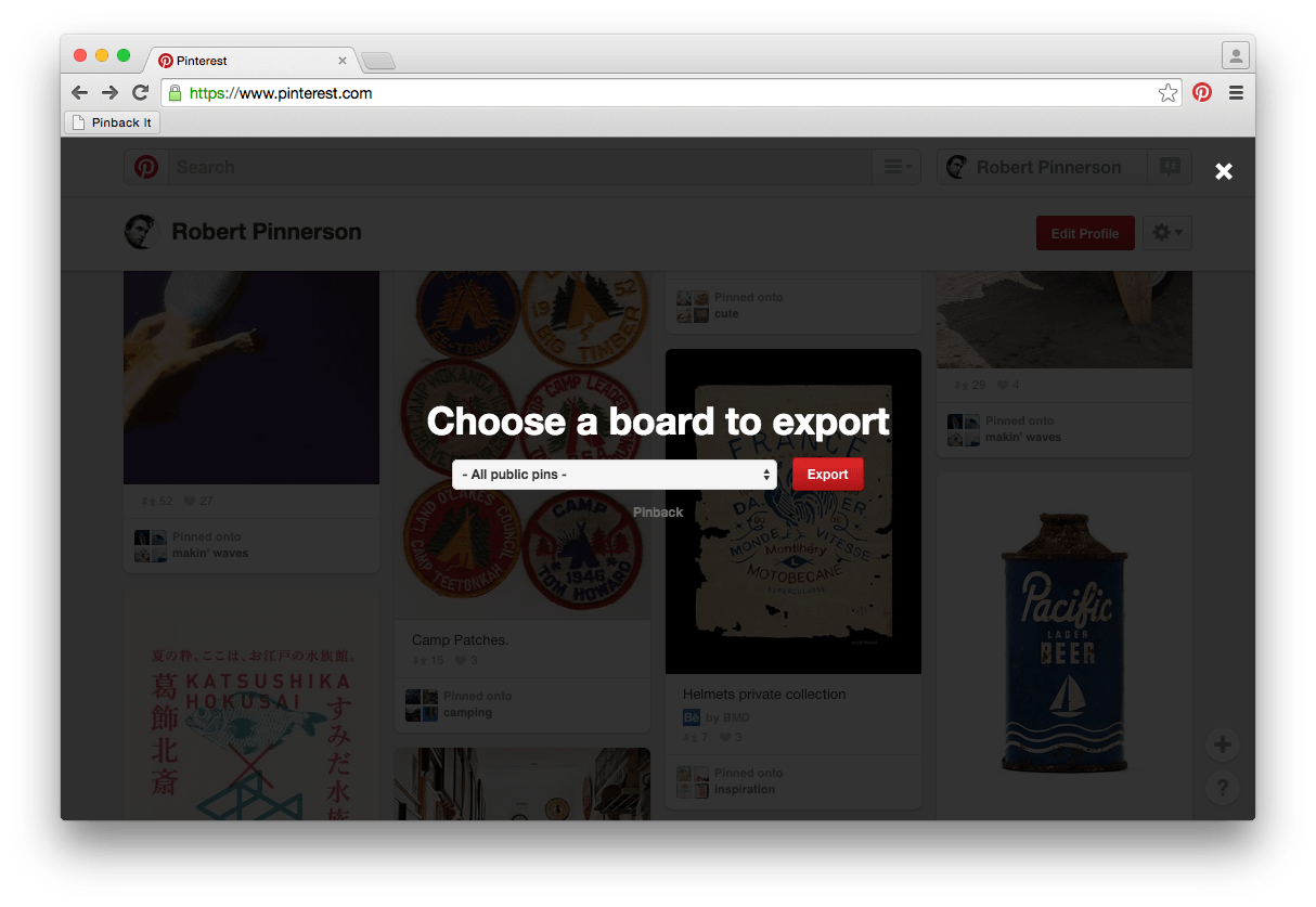 Pinback is a free, simple bookmarklet that allows you to backup and export your Pinterest data. It runs privately in your web browser and exports your pinned links to a Netscape Bookmark-flavored HTML file. This is the de facto standard among web browsers and services like Delicious, making your data safe and easily portable. “Netscape” also has that wonderful artisanal-aged, vintage-inspired sound to it, don’t you think?