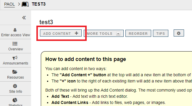 With Sakai, you may need to have your system administrator allow for you to add the LTI External tool. First, under a site page or lesson, click "Add Content".