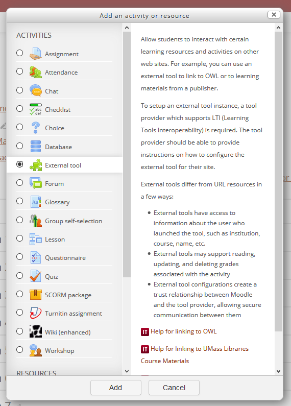 On our installation, you then need to go to "Add External Tool" and select PAOL LTI 2 in the next menu; however, on other installations, you may just select external tool under the general menu.