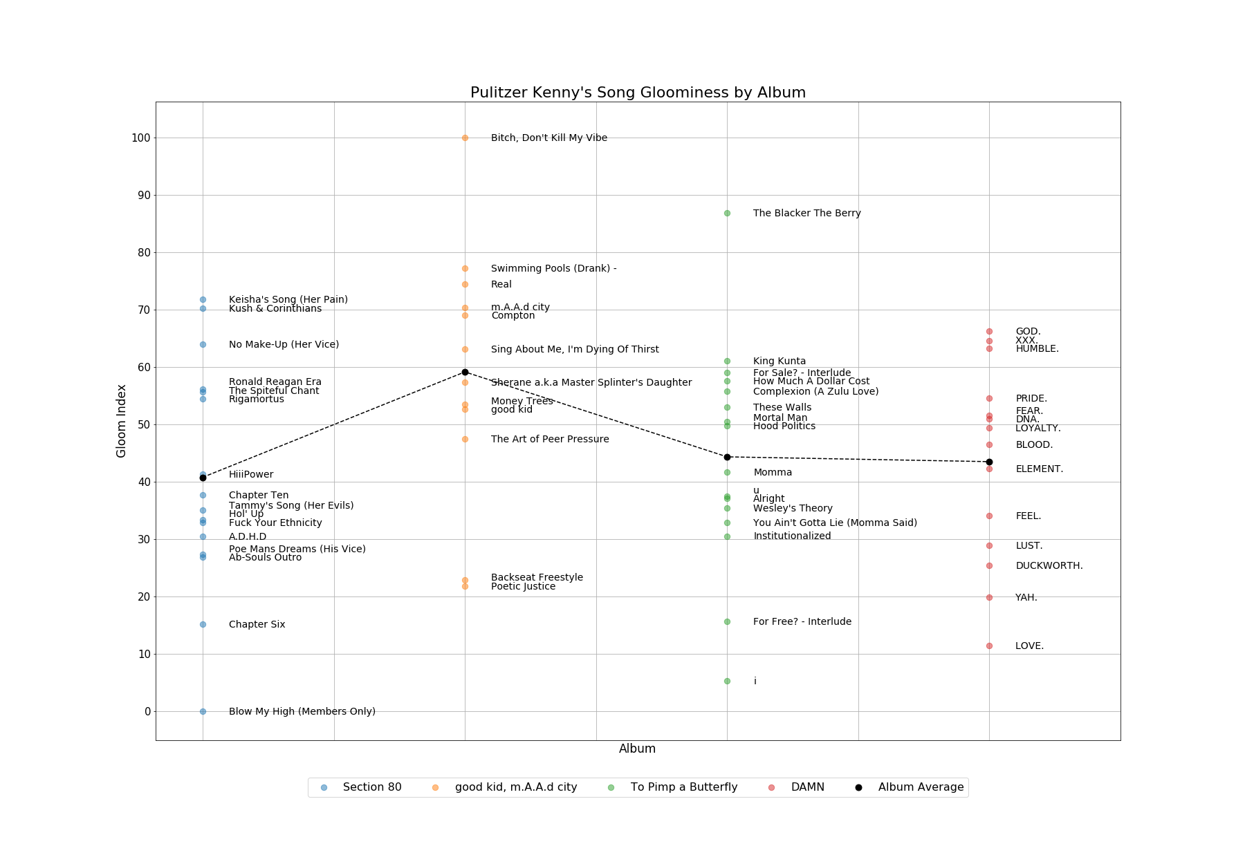 Sentiment analysis of Kendrick Lamar lyrics. View enlarged data visualization