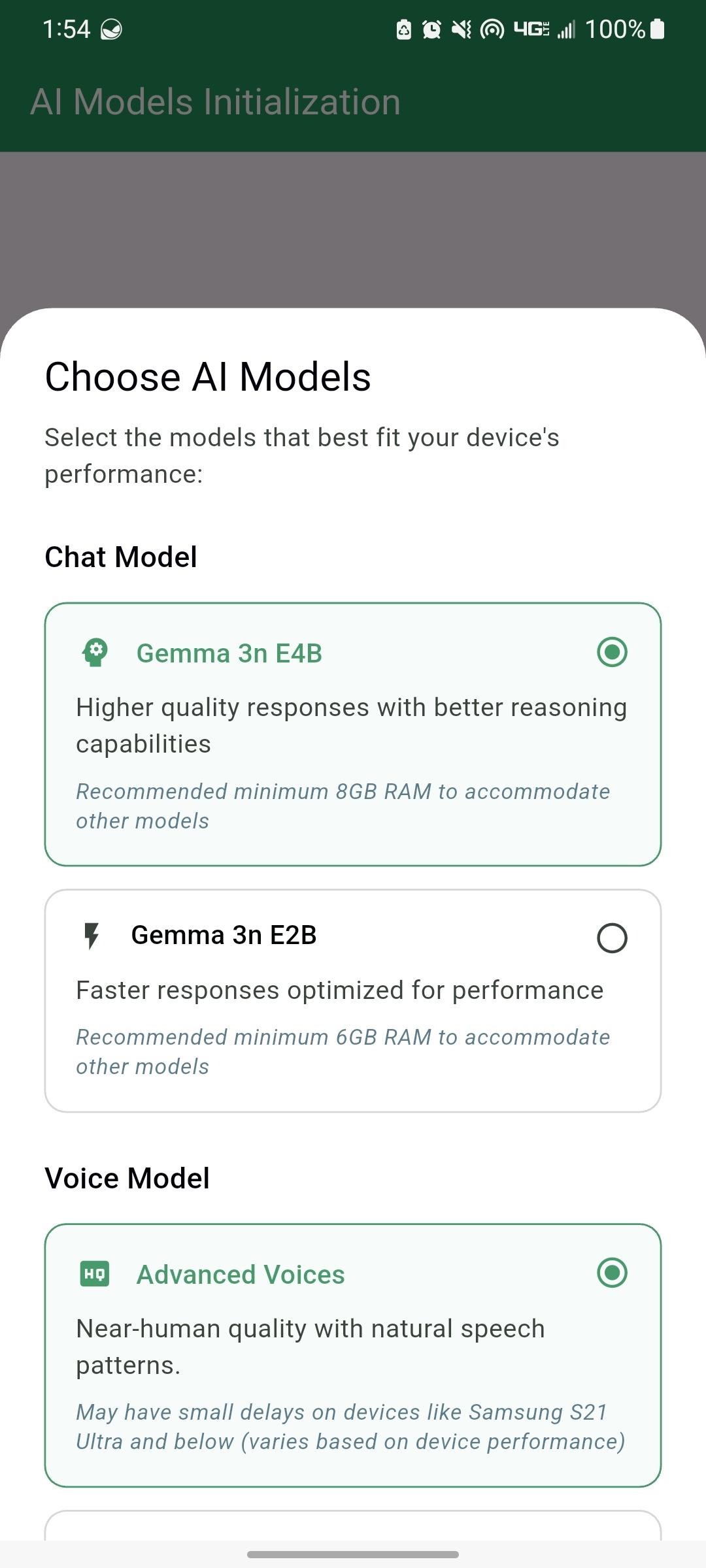 - Gemma 3n E2B (Lite) and E4B (Advanced) for the chat model