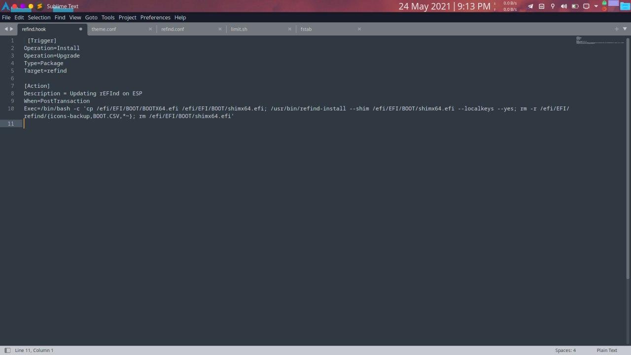 -> Also change the /usr/share/libalpm/hooks/refind.hook to below . Find the hook [here](https://github.com/itzzmesid/Arch-Linux- Installation/blob/main/dotfiles/usr/share/libalpm/hooks/refind.hook)