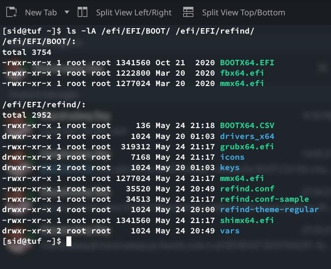-> Once again do ls -lA /efi/EFI/BOOT/ /efi/EFI/refind/ to verify it produces a similar output as below.
