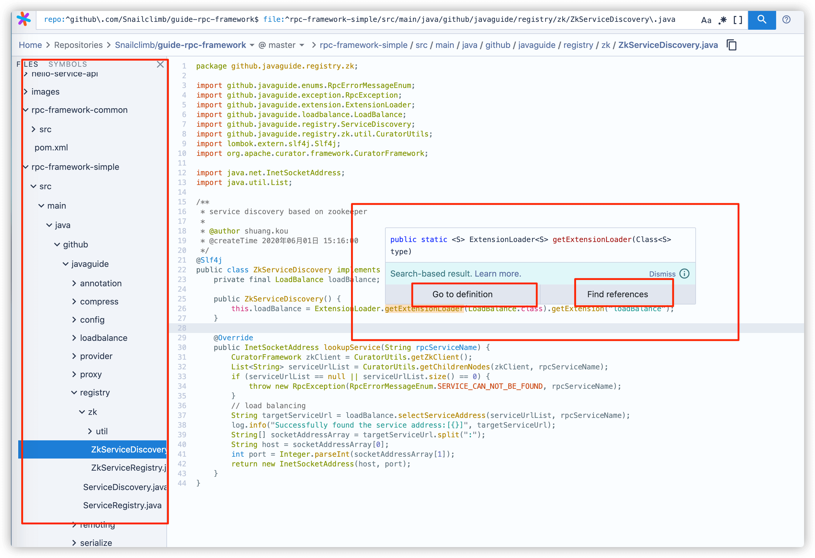 使用 SourceGraph 阅读代码的就像下面这样,同样是树形结构展示代码,但是我个人感觉没有 Octotree 的手感舒服。不过,SourceGraph 内置了很多插件,而且还支持类之间的跳转!