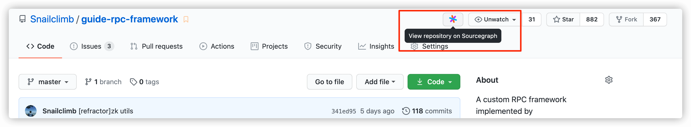 我不想将项目 clone 到本地的时候一般就会使用这种方式来阅读项目源代码。SourceGraph 不仅可以让我们在 Github 优雅的查看代码,它还支持一些骚操作,比如:类之间的跳转、代码搜索等功能。