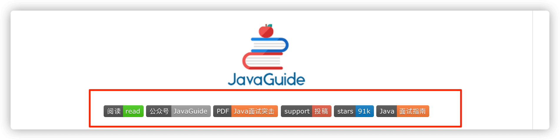 你在 Github 上看到的项目徽章都是通过 https://shields.io/ 这个网站生成的。我的 JavaGuide 这个项目的徽章如下图所示。