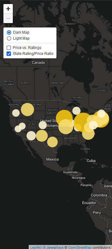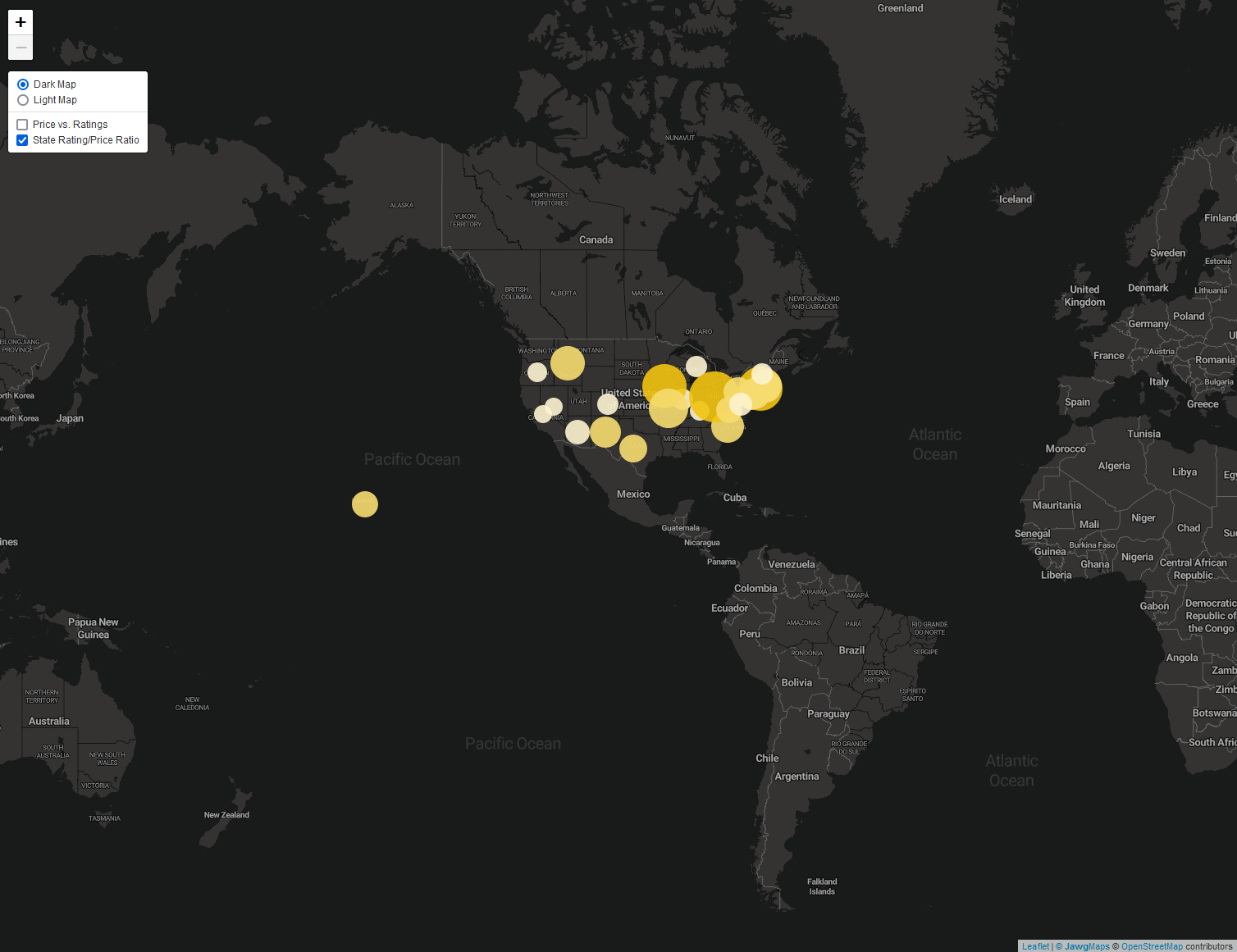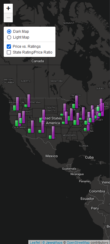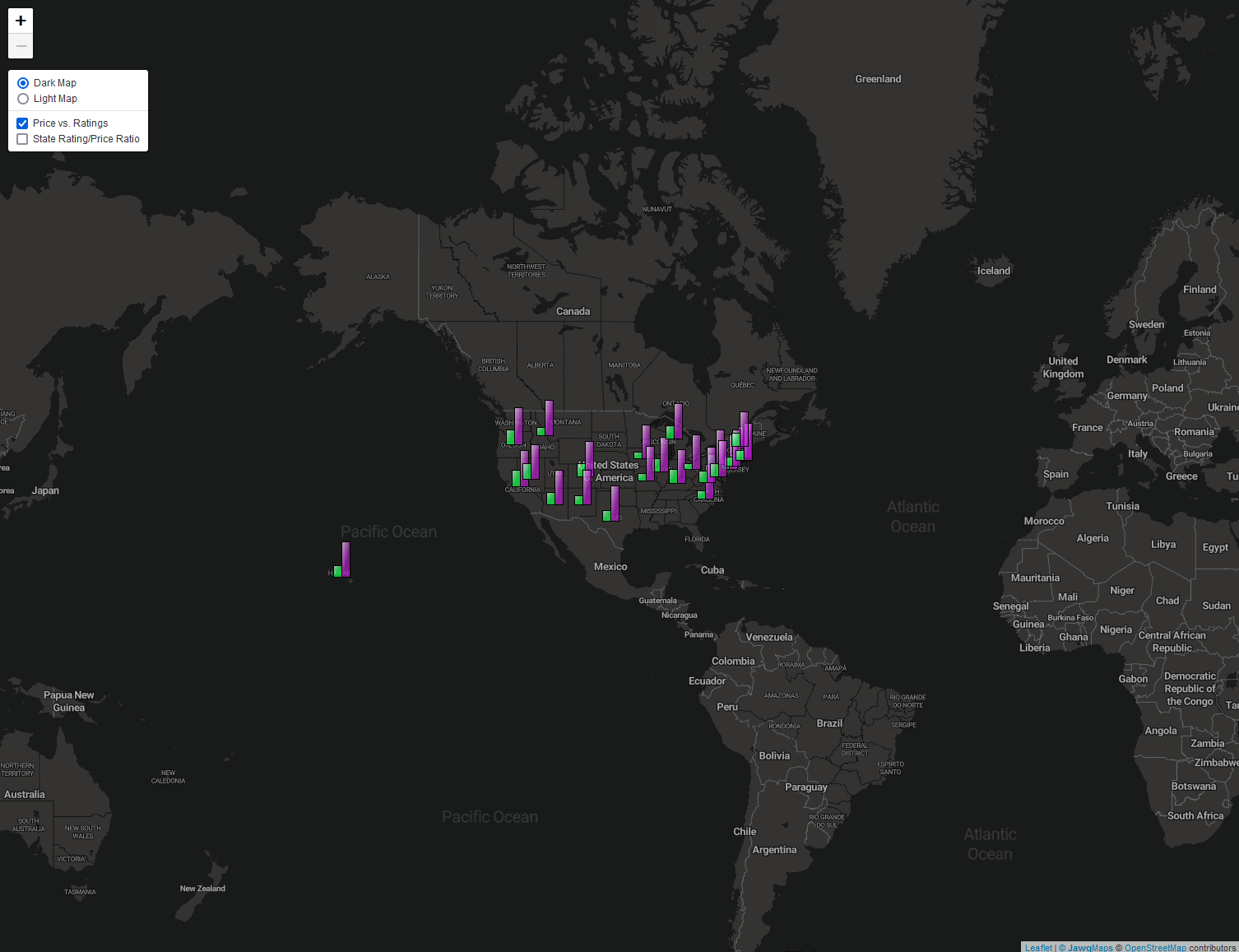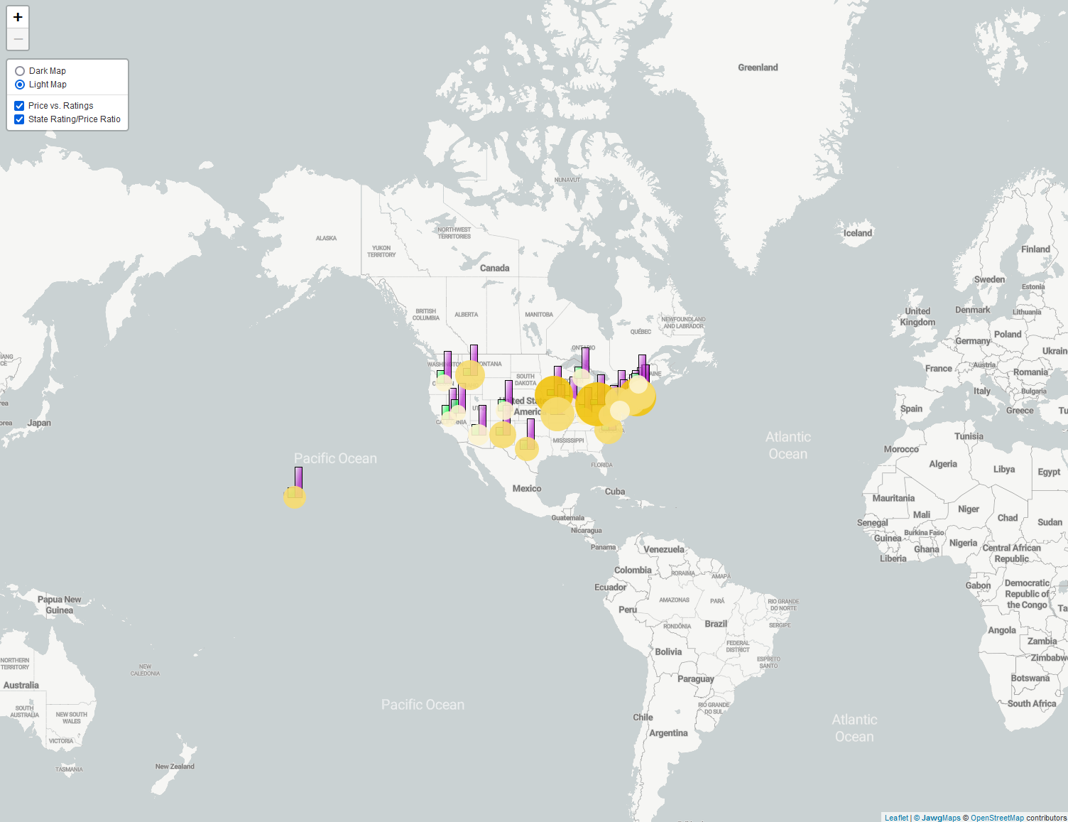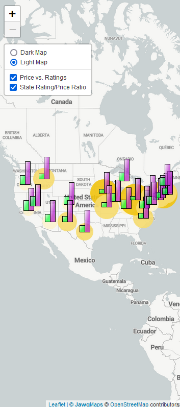 For our new JavaScript library, we will be using a leaflet plugin called "Leaflet Data Visualization Framework" to create bar chart markers for average price and average rating per state. Here is the GitHub link for this plugin: https://github.com/humangeo/leaflet-dvf.