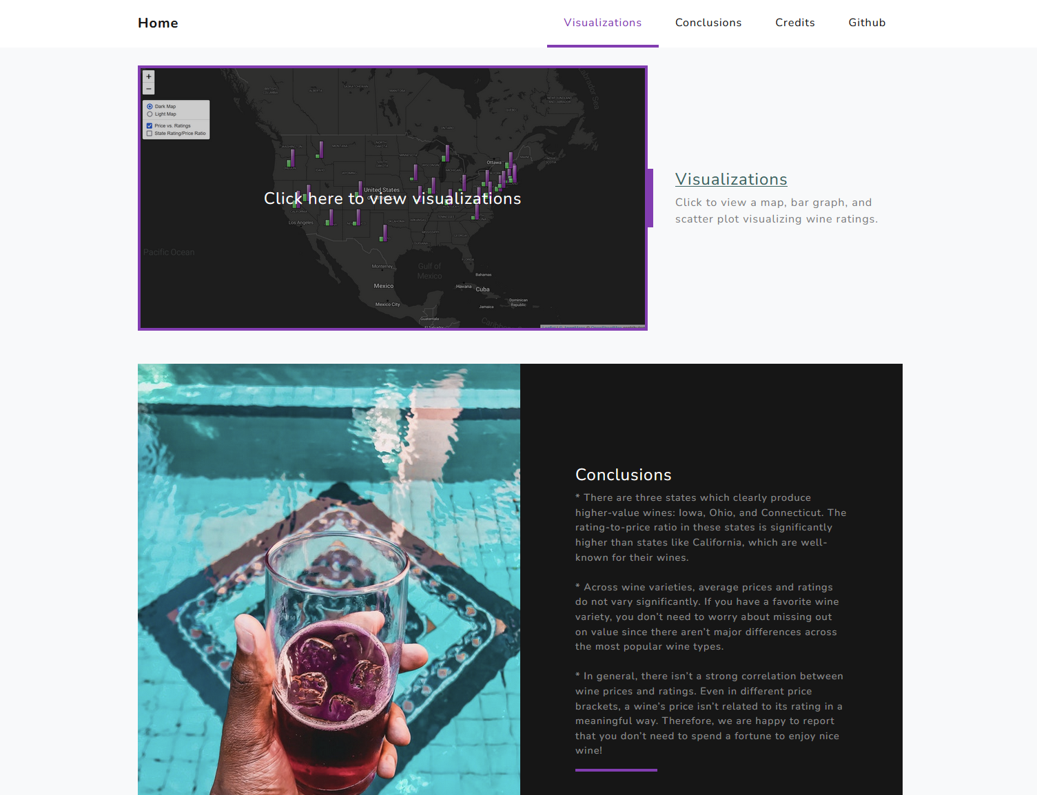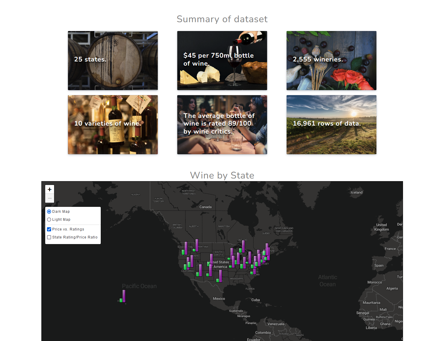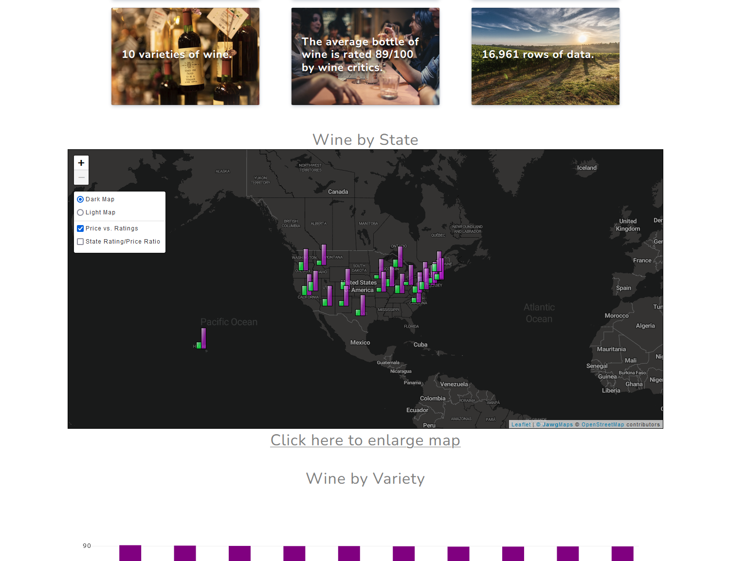 Our goal for this project is to create a set of visualizations to show how wine varieties, pricing, and ratings vary by location in the United States. We also want to show how ratings and price differ between wine varieties. The data set we are using comes from a web scraping project that sourced data points on individual wines from WineEnthusiast back in 2017. The data points collected include country of origin, description, points (rating), region, price, variety, etc.