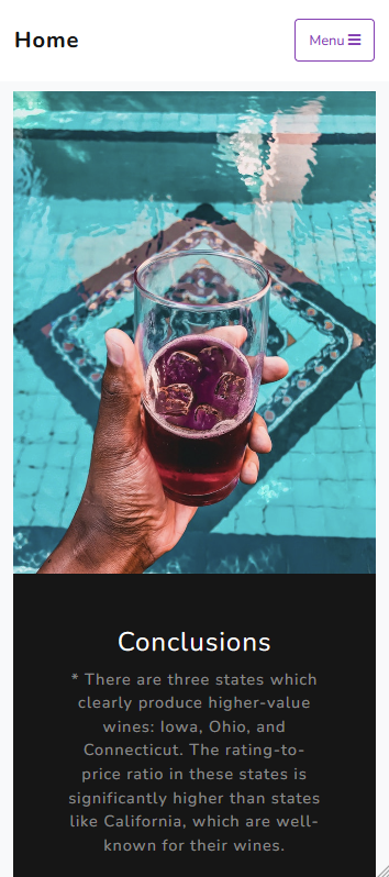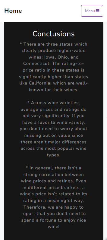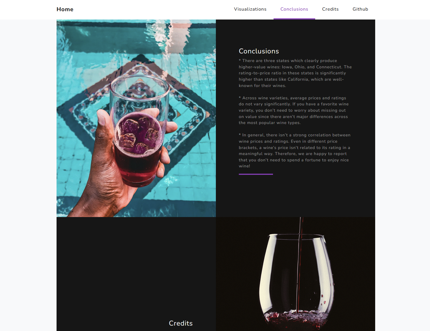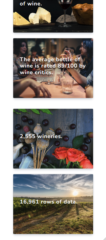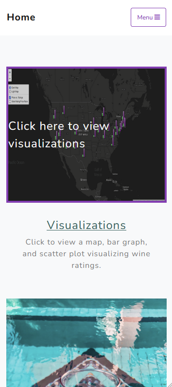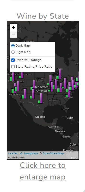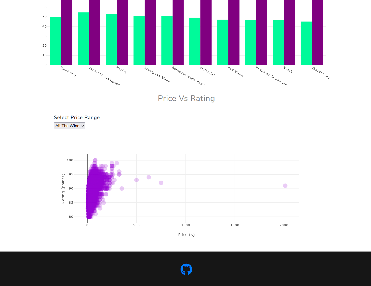Our goal for this project is to create a set of visualizations to show how wine varieties, pricing, and ratings vary by location in the United States. We also want to show how ratings and price differ between wine varieties. The data set we are using comes from a web scraping project that sourced data points on individual wines from WineEnthusiast back in 2017. The data points collected include country of origin, description, points (rating), region, price, variety, etc.