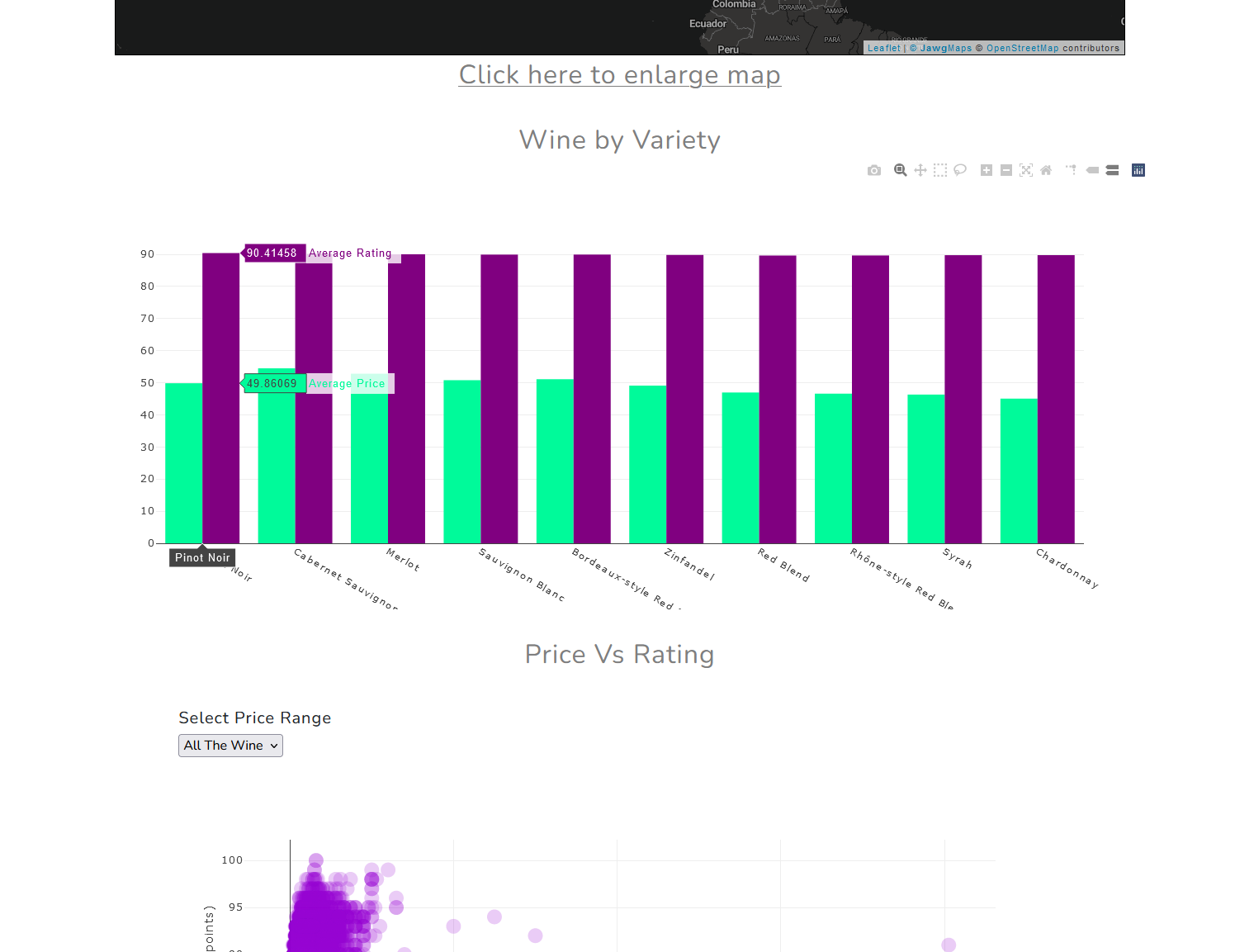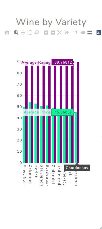 - Combined bar chart showing average bottle price for each wine variety and average rating per variety.