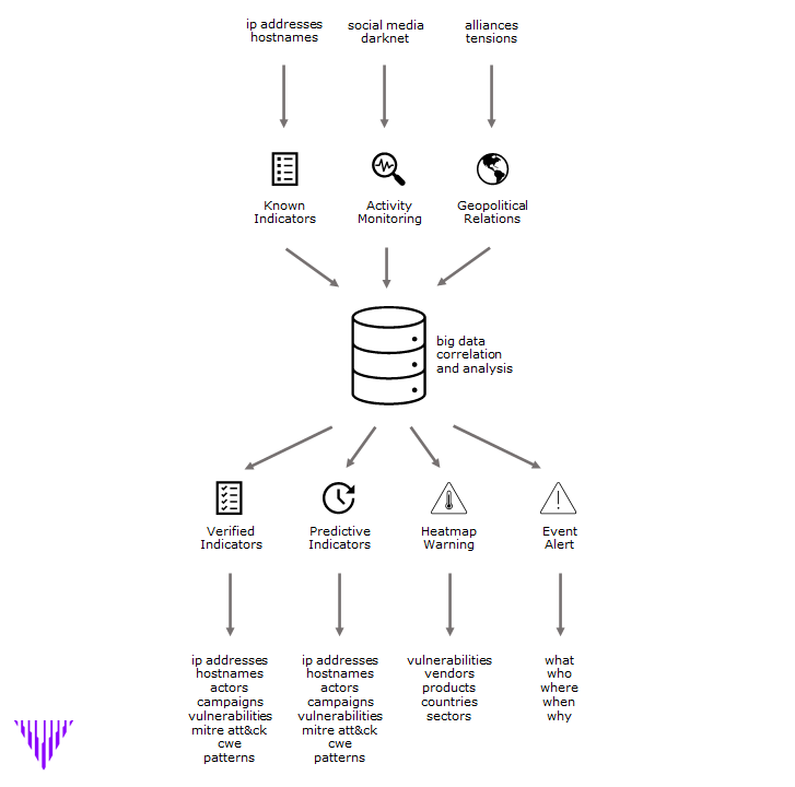 A broad activity monitoring is used to determine the actions by actors. Observing exploit markets on the Darknet, discussions of vulnerabilities on mailinglists, and social media exchanges makes it possible to identify planned attacks.