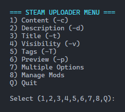 Steam Uploader Menu is a Python script that provides a simple, navigable menu for uploading and updating mods on the Steam Workshop. It acts as a user-friendly wrapper around the Steam Uploader CLI, so you don’t need to remember or type complex commands.