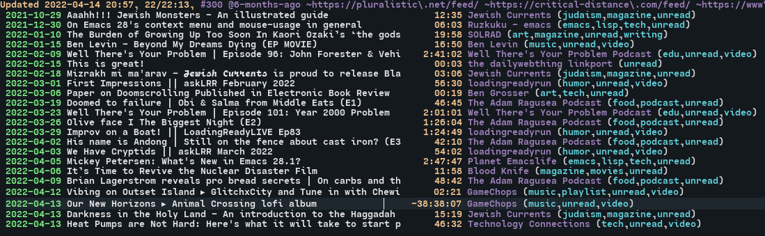 (add-hook 'elfeed-new-entry-hook #'elfeed-time-new-entry 80)For example, if you don’t subscribe to any podcasts with elfeed, you won’t need to add elfeed-time-maybe-get-podcast-info to elfeed-time-new-entry-functions.